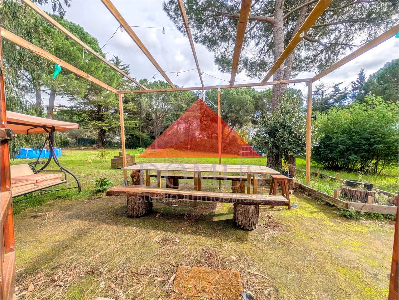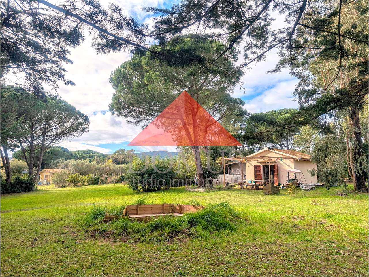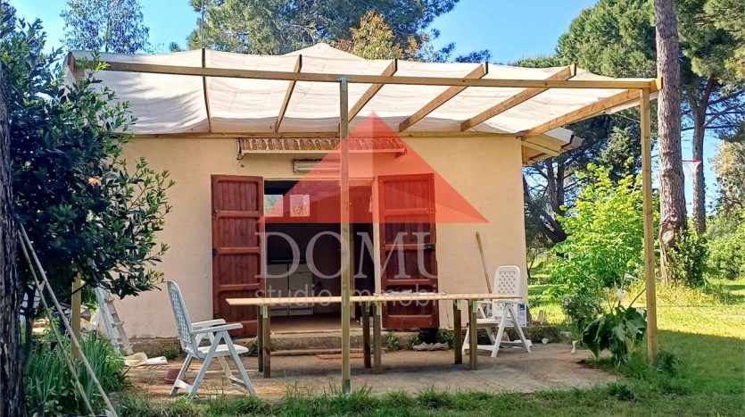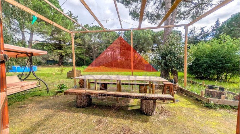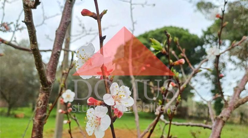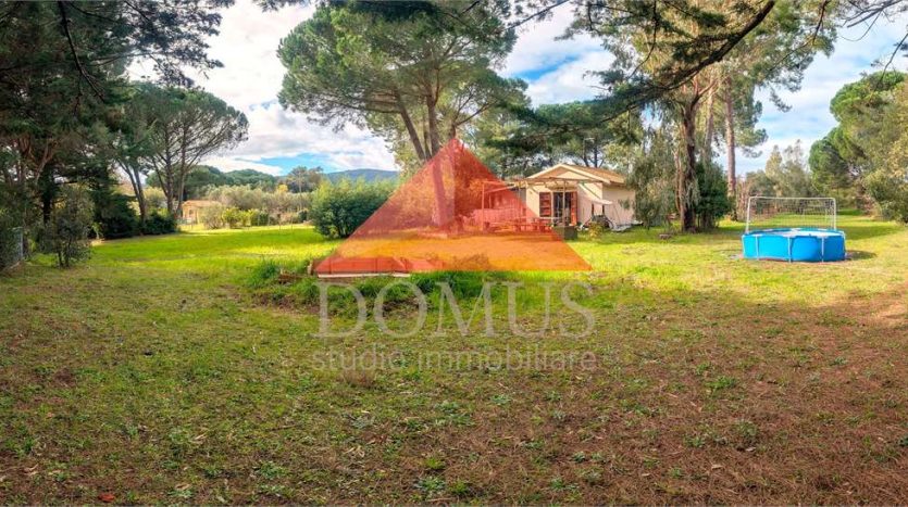 L’immobile comprende un uliveto di circa 1000 m², alcuni alberi da frutto e sempreverdi e un’ampio prato che accoglie un laghetto e una piscina fuori terra di recente installazione.